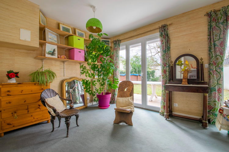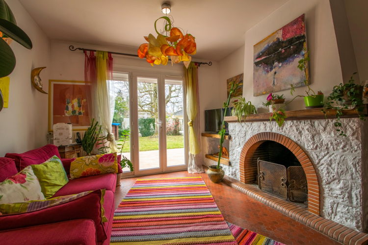 Au RDC, vous retrouverez un grand séjour traversant avec une cheminée, une cuisine, une grande chambre, un bureau, un WC, et des rangements sous les escaliers. Les pièces qui donnent sur le jardin à l’arrière ont toutes une porte fenêtre sur la terrasse : très agréable ! (cuisine, salon, chambre)