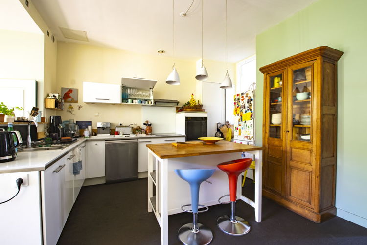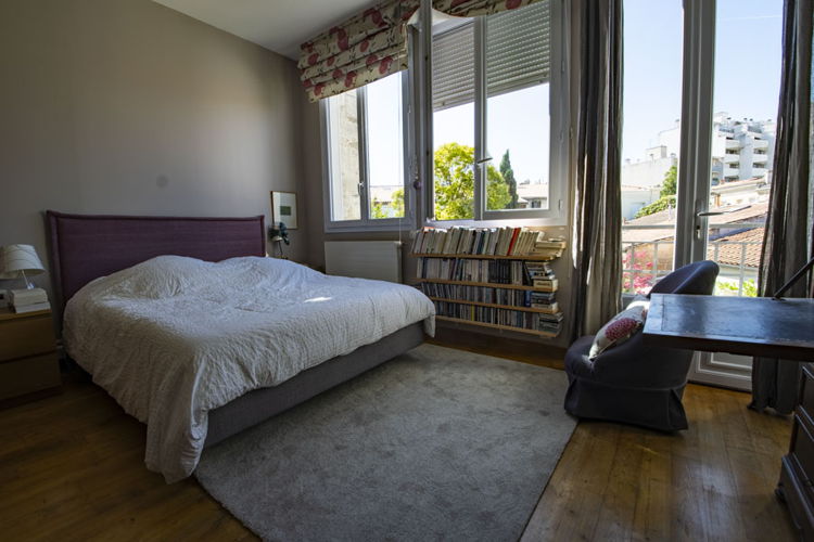 Au 1er étage, auquel on accède par un bel et large escalier, un grand salon, avec insert, ouvrant sur un balcon filant, donne beaucoup de cachet à cette grande pièce lumineuse. Les étagères remplies de disques et de vinyls créent une réelle atmosphère chaleureuse ! On adore ! Une chambre parentale avec vue sur les jardins du quartier avec sa salle d’eau ainsi qu’une salle d’eau toilette complète cet étage.