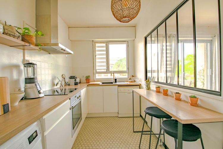 Ce T2 très bien agencé comprend une entrée, une cuisine de 8m2 avec verrière donnant sur la salon de 18m2, un petit cellier, une chambre de 12m2, une salle de bains et un WC séparé. De nombreux rangements intégrés.