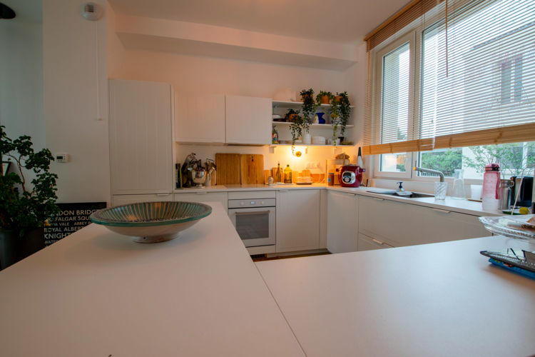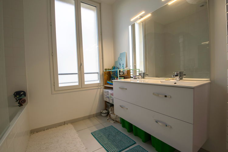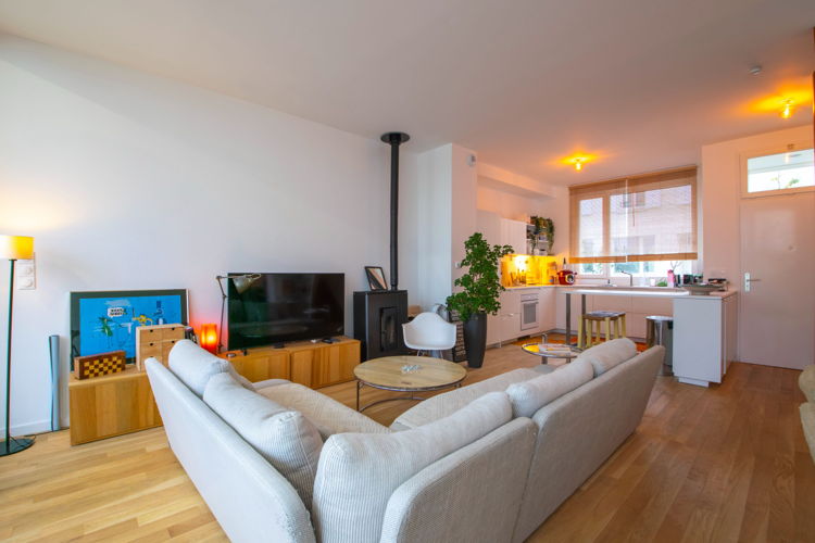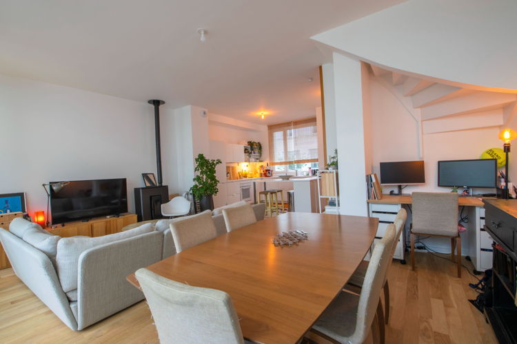 Au RDC, un grand salon-salle à manger avec cuisine ouverte et équipée. De grandes baies vitrées toute hauteur ouvrent sur une terrasse et un jardin de 50m2. Une buanderie et un coin bureau complète cet étage.