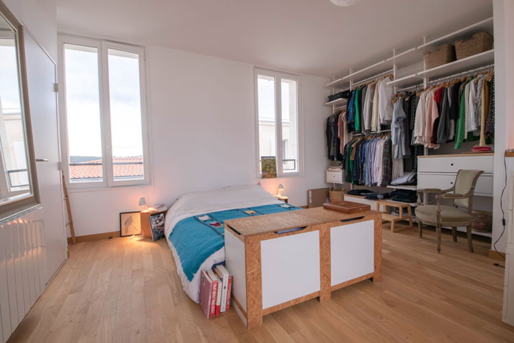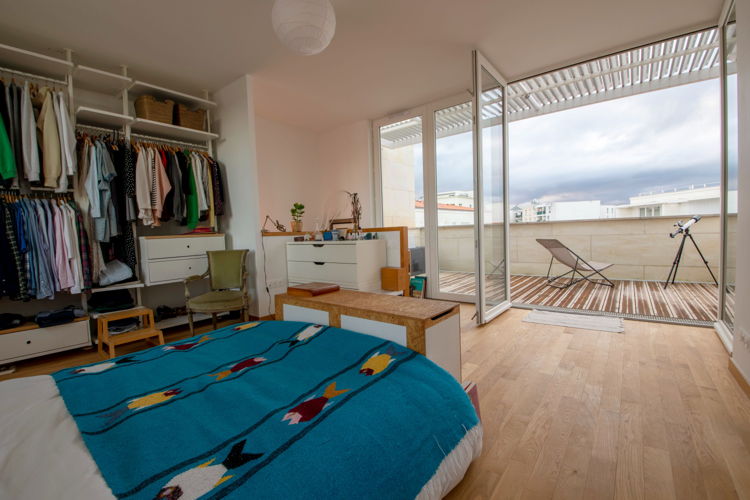 Au 2ème étage, une grande suite parentale de plus de 20m2 équipée d’une salle d’eau et d’un WC est ouverte, toujours avec de grandes baies vitrées toute hauteur sur une terrasse de 15m2 orientée Ouest.