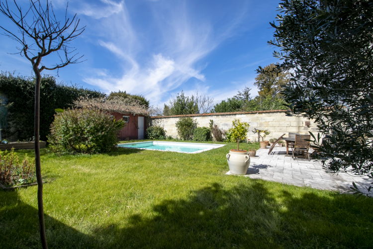 Le jardin de 210m2 sur l’arrière est accessible par le côté sud de la maison : Terrasse, piscine au sel, et dépendance.