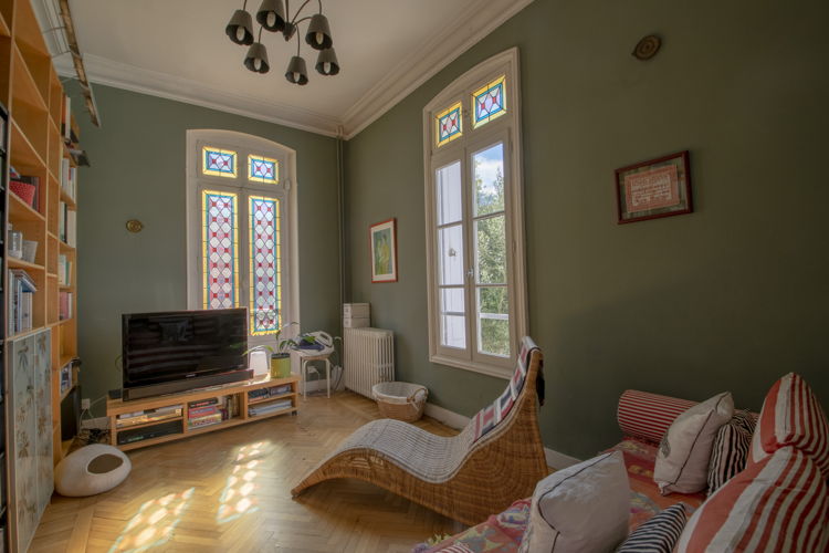 2 salons avec des vitraux d’origine et un poêle, 1 grande salle à manger avec bow-window, une cuisine sur le jardin, 6 chambres, 5 salles d’eau, 5 WC, 1 dressing, 1 bureau, des rangements, 3 balconnets, des hauteurs sous plafonds remarquables, 3 cheminées d’ornement…