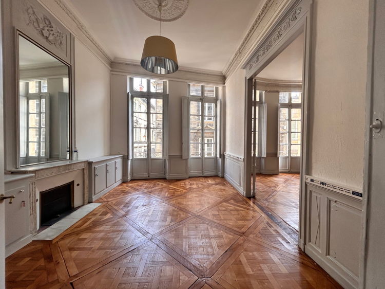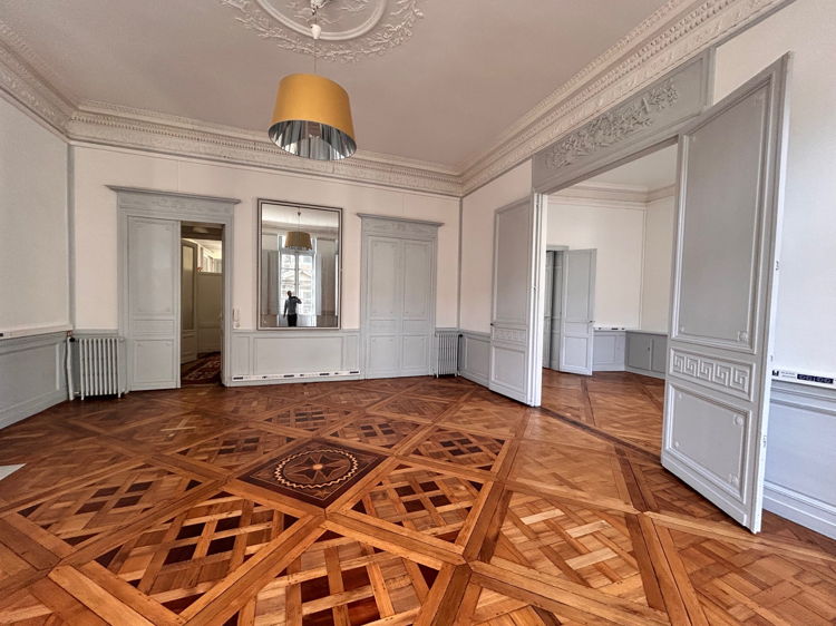 Idéal professions libérales (Experts-Comptables, avocats, architectes, CGP…) - 4 grandes pièces dont une de réception de 50m2. Parquet, moulures, corniches, cheminées, idéal pour recevoir. Grand balcon filant sur rue.